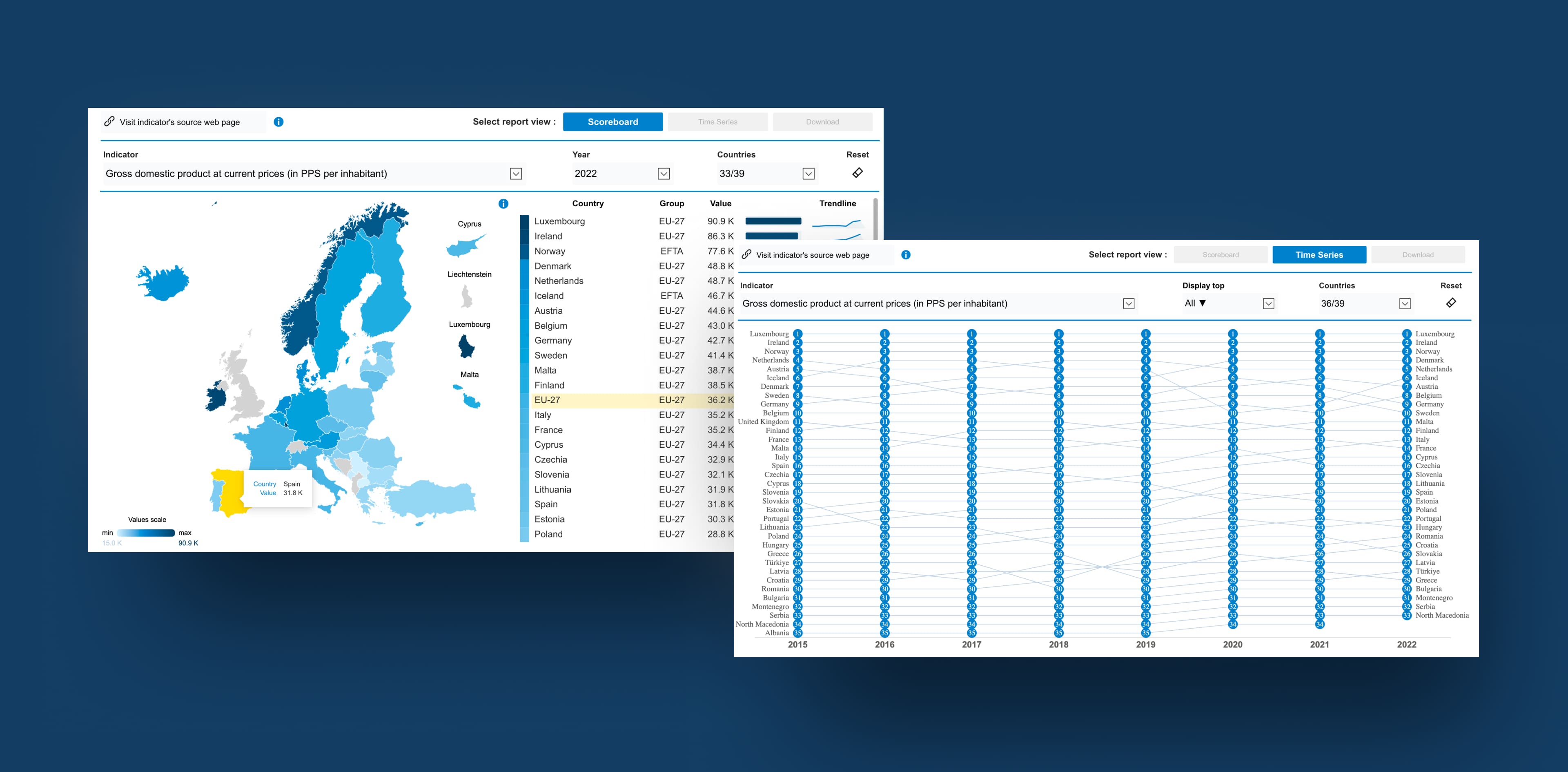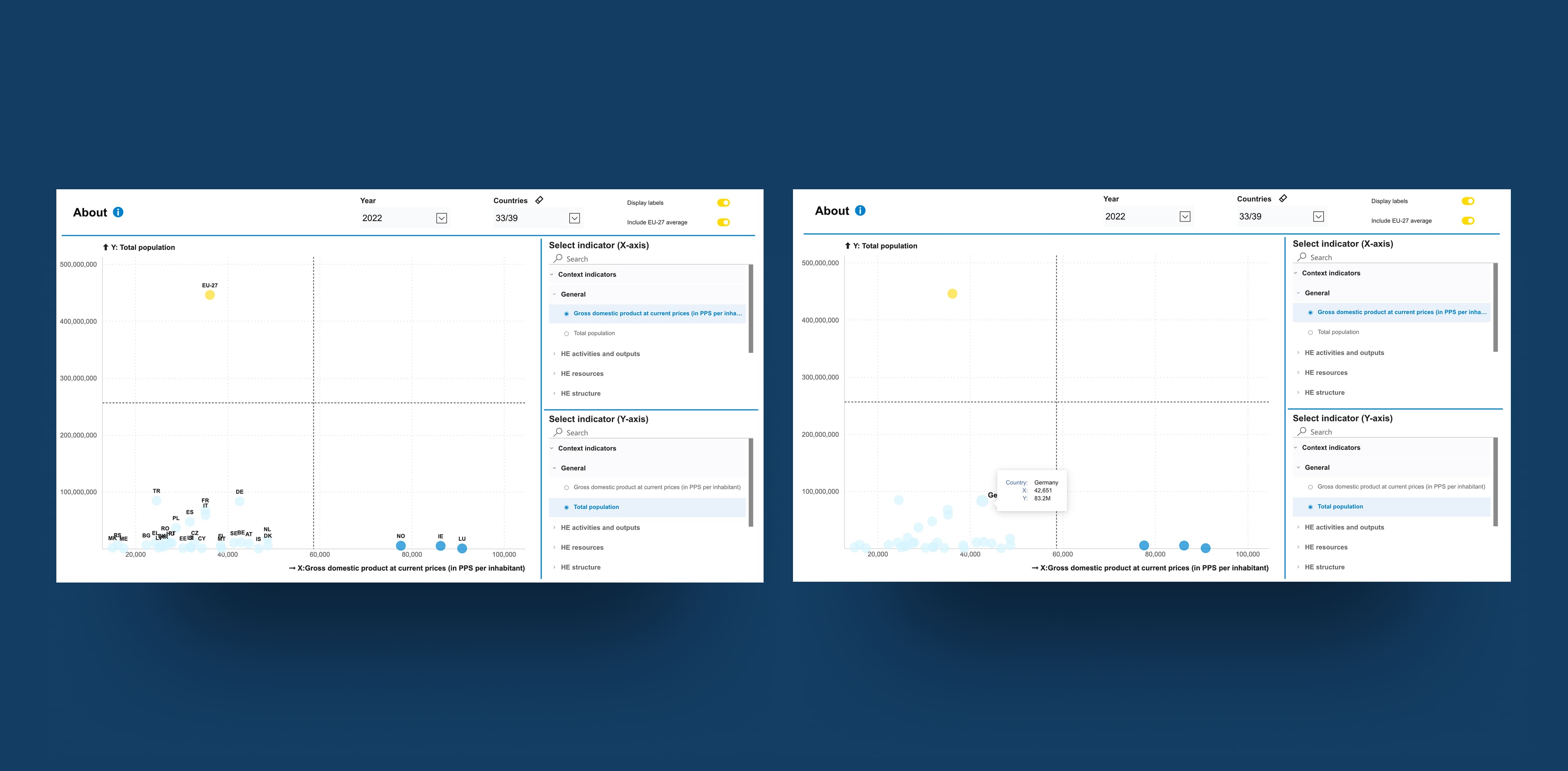 - An EU27 country-level view, allowing users to compare any institution against the aggregated average of all EU member states.