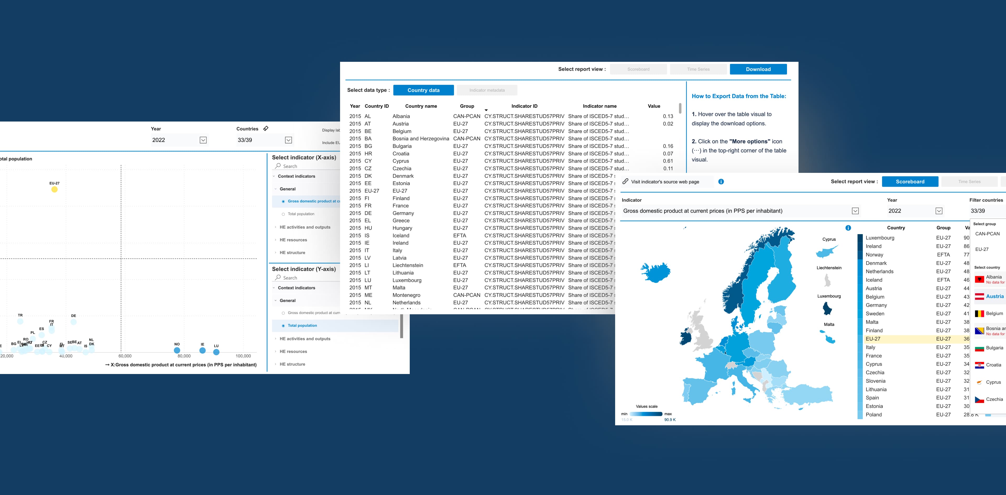 Following the initial rollout, we continued improving the solution through multiple development cycles. Based on user feedback and new analytical needs, we expanded the scoreboard with an additional report (correlation page) and enhanced existing reports with the EU27 overview and a download page. These iterations strengthened overall navigation, improved user experience and clarity, and increased interactivity across the tool, enabling users to work with the data more effectively.